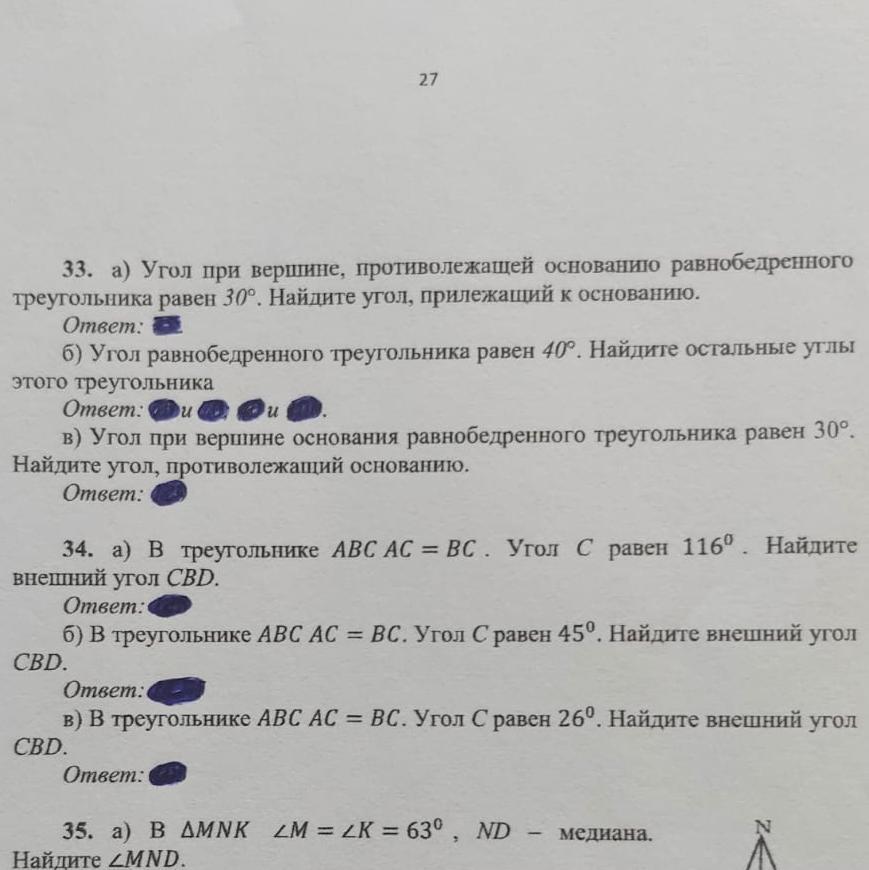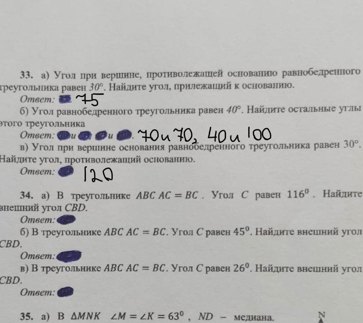 Соответственно 2 угол при основании тоже равен 30 градусам