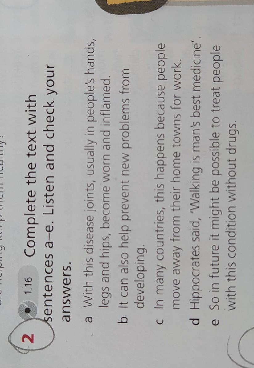 2. 1.16 Complete the text with sentences a-e. Listen and check your answers. a With this disease joints, usually in people's hands, legs and hips, become worn and inflamed. b It can also help prevent new problems from developing c In many countries, this happens because people move away from their home towns for work. d Hippocrates said, 'Walking is man's best medicine'. e So in future it might be possible to treat people with this condition without drugs.