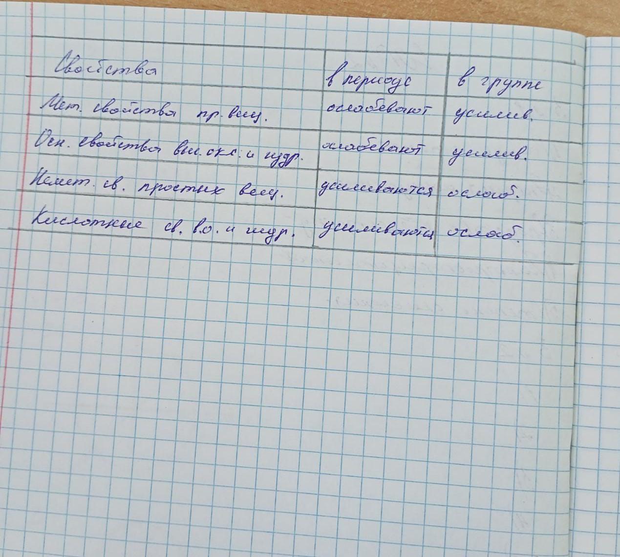 Спрогнозируйте закономерность изменение свойств простых веществ и соединений в периоде (слева на права)и группе (сверху вниз).Используйте слова ослобевают усиливаются