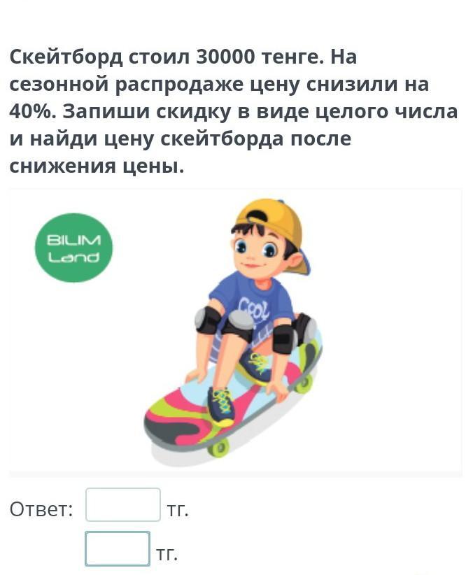 30000 - 12000 = 18000 тенге стал стоить скейтборд после снижения цены