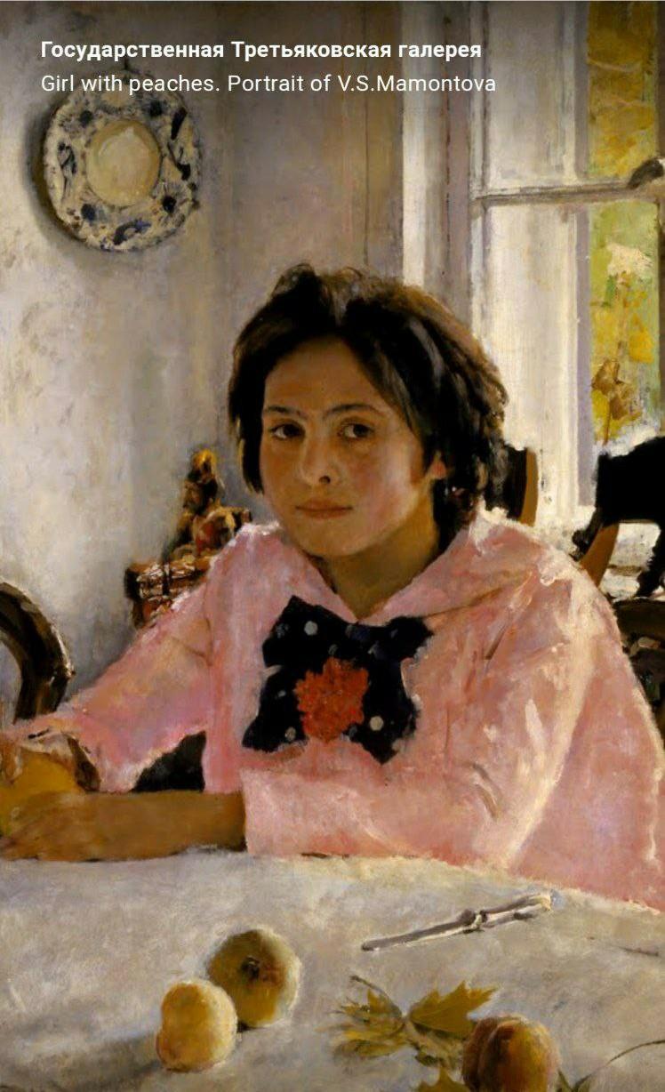 В большой светлой комнате возле стола сидит девочка с персиком в руках. Ее черные непослушные волосы растрепались, а темные глаза смотрят прямо на зрителя. Этот задумчиво- лукавый взгляд знаком многим по описанию картины «Девочка с персиками» Серова. Девочку, изображенную на картине, зовут Веруша Мамонтова. Ее, дочь известного московского предпринимателя, молодой художник Серов впервые увидел в возрасте 11-ти лет. Девочка с персиком в руке вбежала в комнату - и художник ей позировать. Так родилась великая картина. Всего лишь 22. «Девочка с персиками» стала одной из его первых прославленных картин. Художник вспоминал, что эта работа далась ему нелегко. Он писал Веру целых два месяца. Непоседливой девочке быстро надоедало позировать. А Серов очень хотел нарисовать ее именно такой,икакой он ее видел. Живой, веселой и юной. И ему это удалось: до самой смерти художника его будут узнавать по этому произведению. Вера Мамонтова сидит у стола, застеленного белой скатертью. На столе лежит нож и несколько крупных персиков. При первом же взгляде них так и тянет взять персик в руки, покрутить и затем надкусить. Именно так и сделала девочка - она взяла один из плодов и сложила на нем руки. Но вот думает она явно не о персике. Об этом говорит и ее поза, и ее взгляд, уходящий куда-то вдаль. Вера одета в нежно-розовую блузку, оттененную крупным черным бантом. Мне кажется, что этот бант играет большую роль на этой картине. Эта та деталь, которая раскрывает характер Верь, яркие и полные неожиданностей. А комната вокруг девочки наполнена светом и теплом. Мягкие розовые, золотые и голубые цвета перетекают один в другой. Даже на темно- коричневых спинках стульев заметны солнечные блики. Сразу понятно, что здесь проходит радостное детство. Впечатление Серов подарил картину матери девочки, полотно долгое время висело в той самой комнате, которая на нем нарисована. А как же сложилась судьба самой Веры? Перед тем, как писать сочинение по картине «Девочка с персиками» Серова, мне захотелось прочесть об этом. Она проживет счастливую, но недолгую жизнь и умрет в 32 года. От ее красоты сохраняется только картина ...