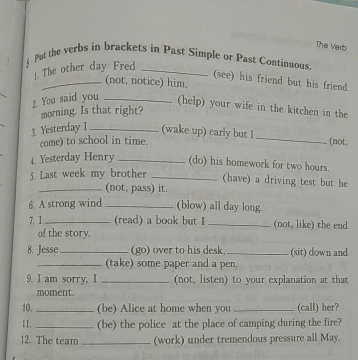Put the verbs in brackets in Past Simple or Past Continuous. The other day Fred (see) his friend but his friend (not, notice) him. 2 You said you morning. Is that right? (help) your wife in the kitchen in the 3. Yesterday I come) to school in time. (wake up) early but I (not, 4. Yesterday Henry 5. Last week my brother (not, pass) it. (do) his homework for two hours. (have) a driving test but he 6. A strong wind 7. I. of the story. (blow) all day long. (read) a book but I (not, like) the end 8. Jesse (go) over to his desk, (take) some paper and a pen. t (sit) down and 9. I am sorry, I (not, listen) to your explanation at that moment. 10. (be) Alice at home when you (call) her? (be) the police at the place of camping during the fire? (work) under tremendous pressure all May. 11. 12. The team
