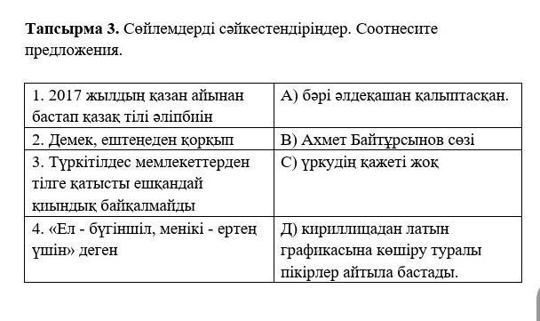 Тапсырма 3. Сөйлемдерді сәйкестендіріңдер. Соотнесите предложения. 1. 2017 жылдың қазан айынан бастап қазақ тілі әліпбиін А) бәрі әлдеқашан қалыптасқан. 2. Демек, ештеңеден қорқып В) Ахмет Байтұрсынов сөзі 3. Түркітілдес мемлекеттерден тілге қатысты ешқандай қиындық байқалмайды С) үркудің қажеті жоқ 4. «Ел - бүгіншіл, менікі - ертең үшін» деген Д) кириллицадан латын графикасына көшіру туралы пікірлер айтыла бастады.