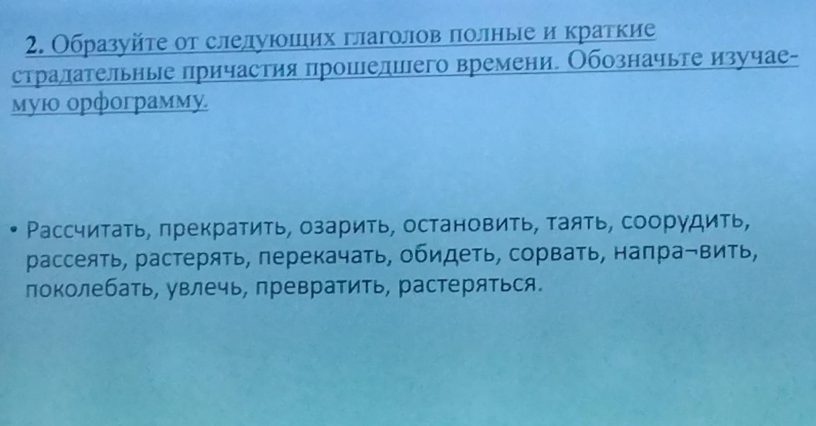 Рассчитанный, рассчитан; прекращённый, прекращён; озарённый, озаён; остановленный, остановлен; сооружённый, сооружён; рассеянный, рассеян; растерянный, растерян; перекачанный, перекачан; обиженный, обижен; сорванный, сорван; направленный, направлен; поколебленный, поколеблен; увлечённый, увлечён; превращённый, превращён;