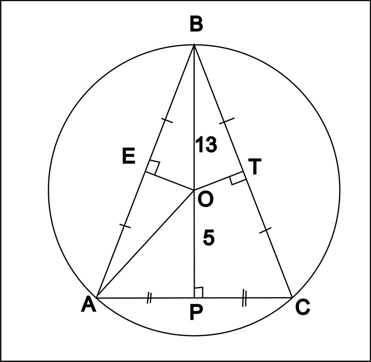 центр описанной окружности лежит на высоте разнобедренного треугольника и делит высоту на отрезки, равны 5 см и 13 см. Найдите площадь этого треугольника