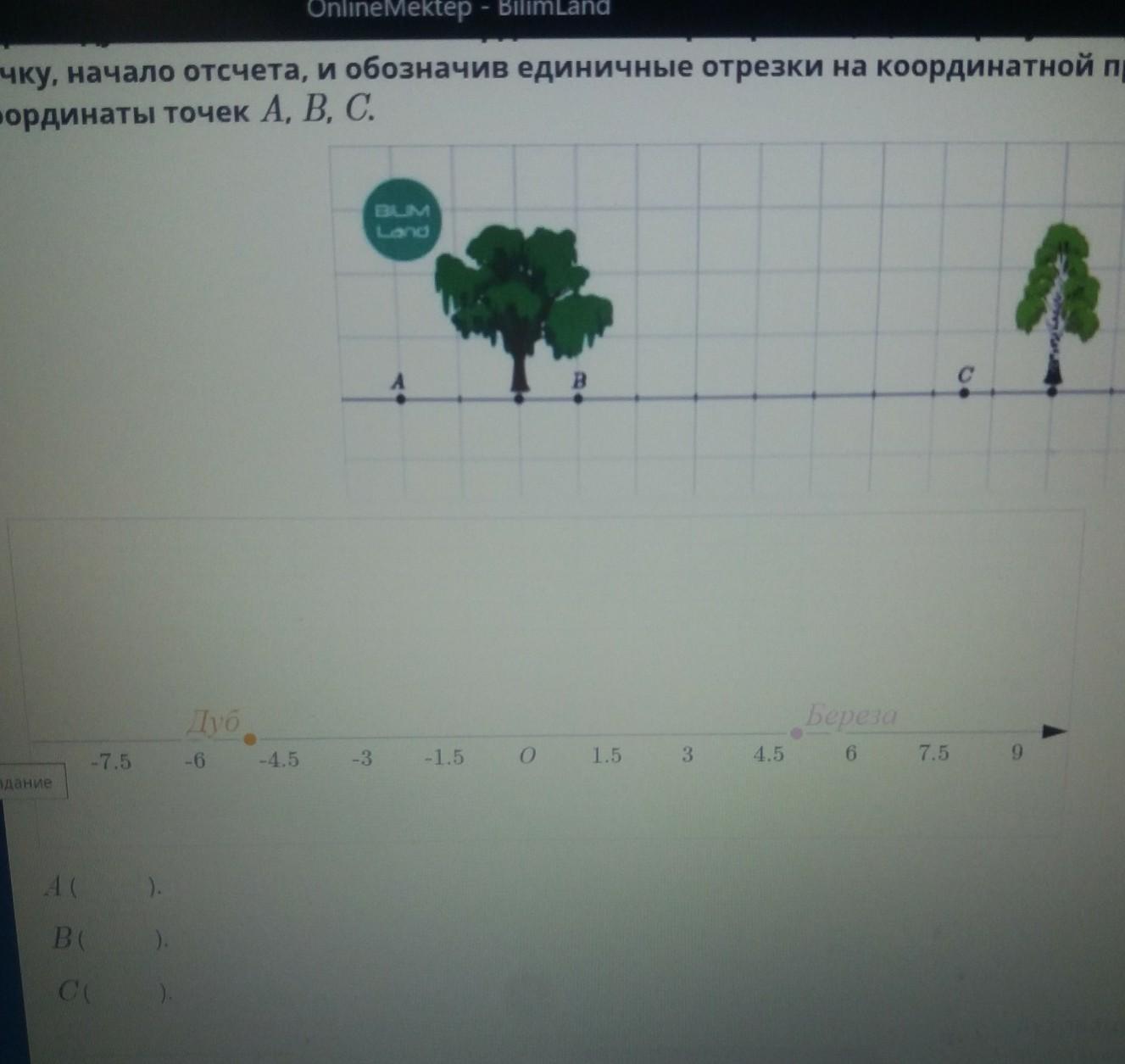 Дерево дуб отметили точкой, координата которой равна (-5), а березу - координатой (5). Отметив точку, начало отсчета, и обозначев единичные отрезки на координатной прямой, запиши координаты точек А, В, С.