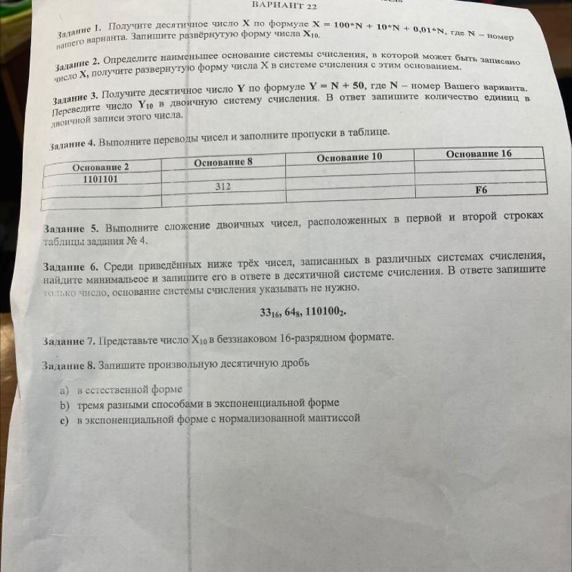 Задание 1. Получите деситичное число V по формуле у N 510, где N - номер Вашего варианта,