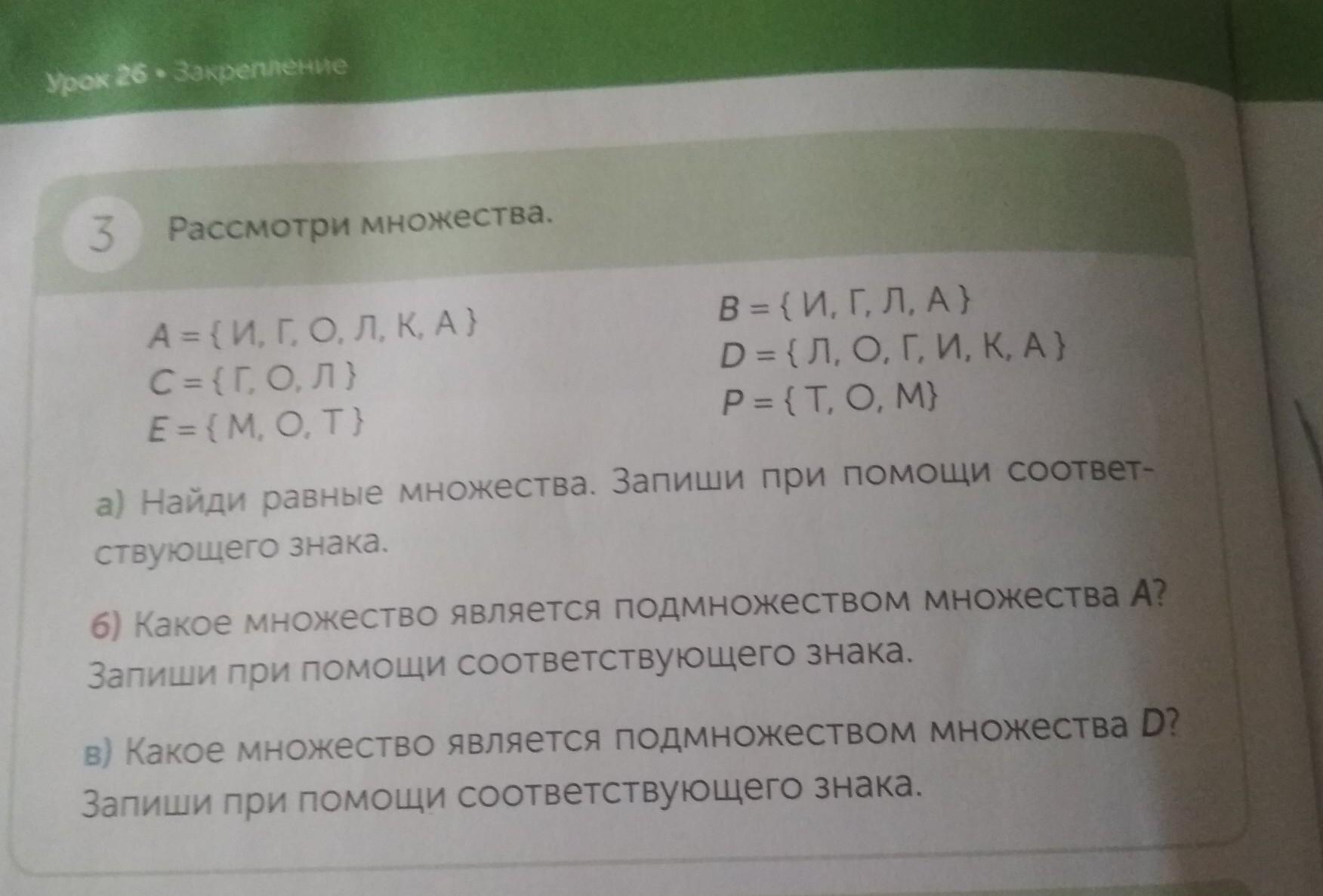 Урок 26 • Закрепление 3 Рассмотри множества. А = {И, Г, О, Л, K, A} C = {Г, О, Л} E = {M, O, T} В = {И, Г, Д, А} D = {Л, О. Г. И, К, А } Р= {T, O, M} а) Найди равные множества. Запиши при помощи соответ- ствующего знака. 6) Какое множество является подмножеством множества А? Запиши при помощи соответствующего знака. в) Какое множество является подмножеством множества D? Запиши при помощи соответствующего знака.