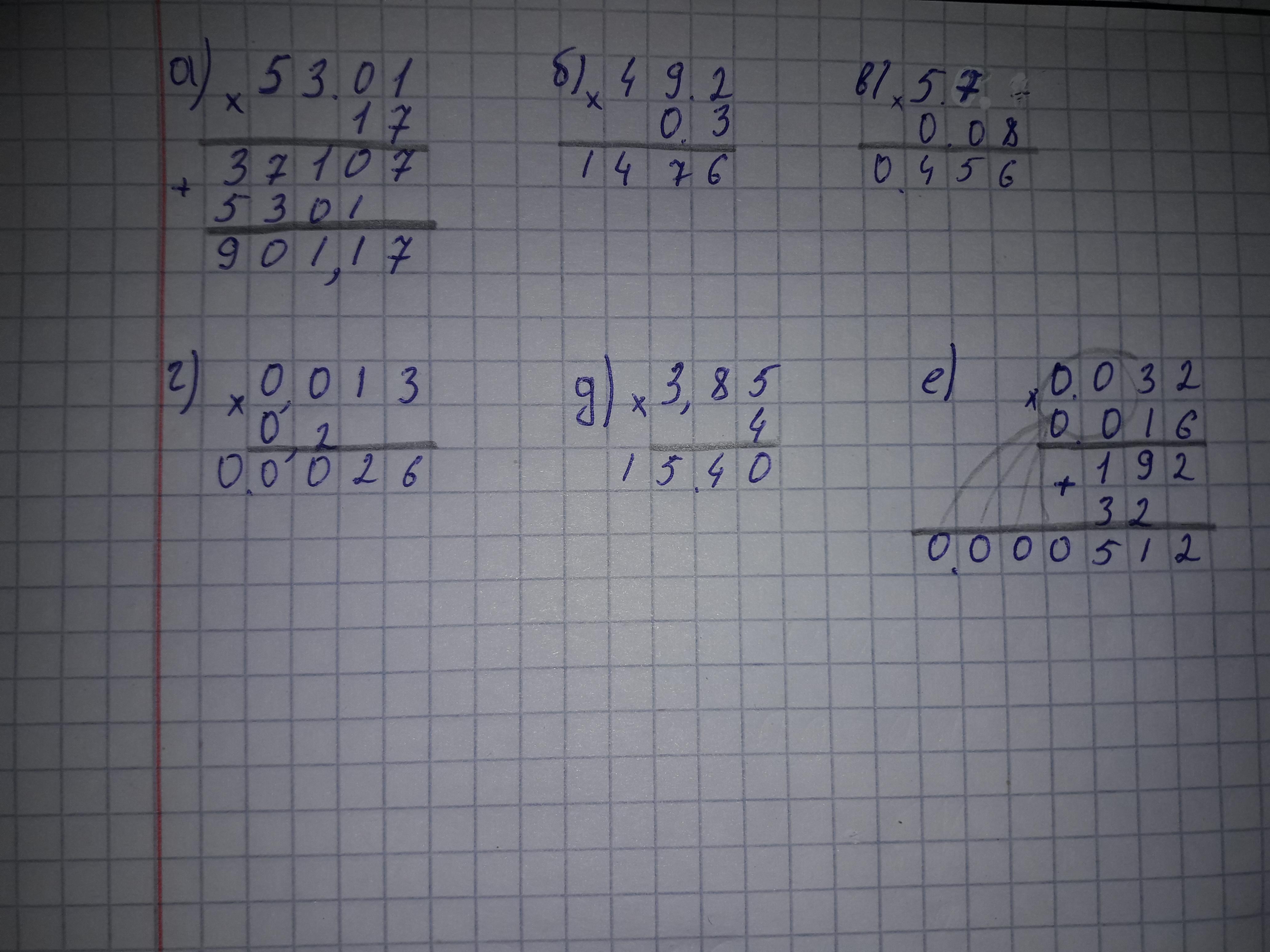 Вычислите 53,01 х 17 б) 49,2 х 0,3 в) 5,7 х0,08 г) 0,2 х 0,013 д) 3,85 х 4 е) 0,032 х 0,016 в столбик умоляю Срочно