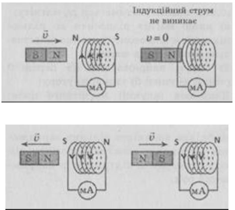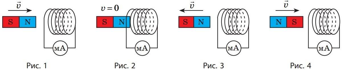 На рис. 1-4 зображено штабовий магніт, котушку-моток (далі – котушка), приєднану до міліамперметра, та зазначено напрямок швидкості руху магніту.