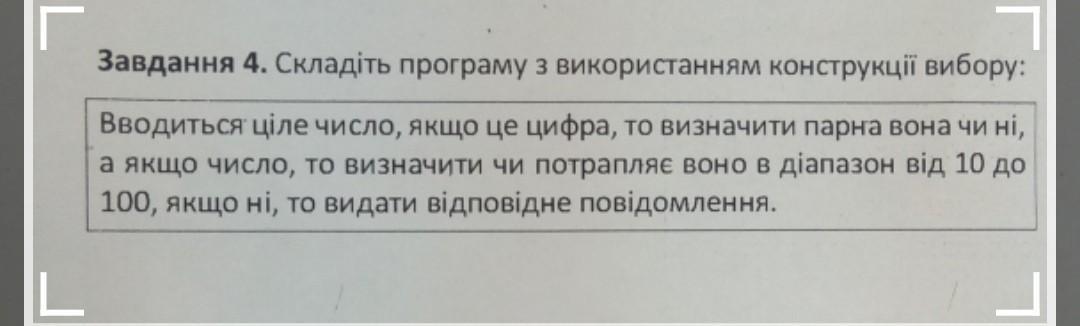 C++ Завдання 4. Складіть програму з використанням конструкції вибору: Вводиться ціле число, якщо це цифра, то визначити парна вона чи ні, а якщо число, то визначити чи потрапляє воно в діапазон від 10 до 100, якщо ні, то видати відповідне повідомлення.