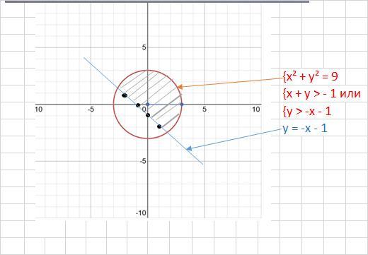 Множество точек, заданных системой неравенств, будет лежать внутри круга выше графика прямой x+y = -1