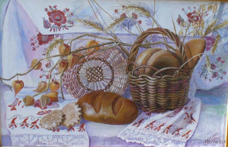 На столе надета белая скатерть , она чиста и не запачкана что обозначает люди чистолюбивые, по верх накинуто белое полотенце с красными рисунками. У краешка стола стоит корзинка свежего хлеба из корзинки как декор стоят зашушеные цветы-это очень красиво, торчать маленькие колоски рожи золотистого цвета. Рядом с карзинкой лежит еще тот же свежеиспеченный хлебушек.