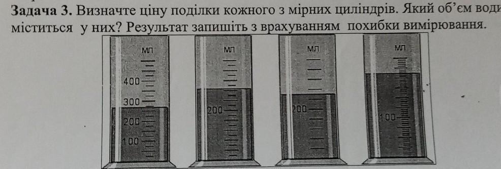 Задача 3. Визначте ціну поділки кожного з мірних циліндрів. Який об'єм води міститься у них? Результат запишіть з врахуванням похибки вимірювання.