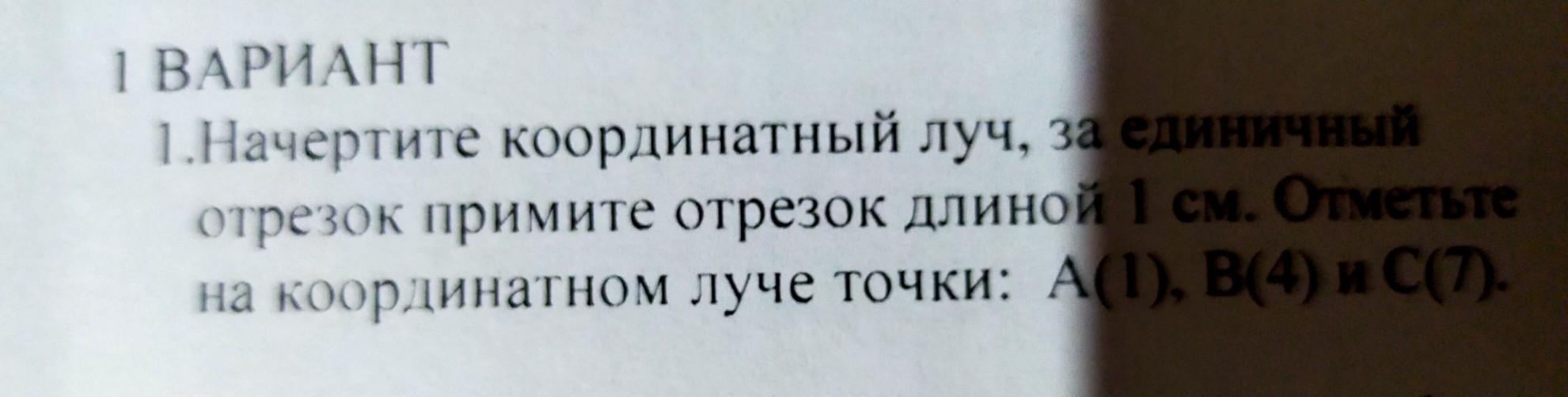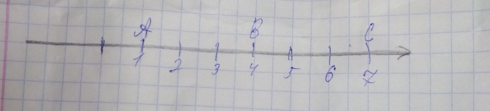 начертите координдинатный луч ,за единичный отрезок примите отрезок длинной 1 см.Отметьте на координатном луче точки A(1) B(4) C(7)