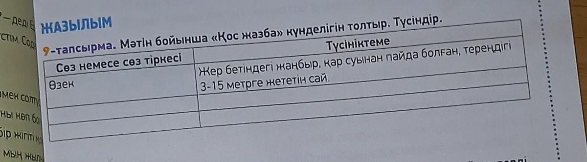 9-тапсырма . мәтін бойынша қос жазба күнделігін толтыр түсіндір жер бетіндегі жаңбыр қар суыннан пайда болған тереңдігі 3 15 метрге жететін сай