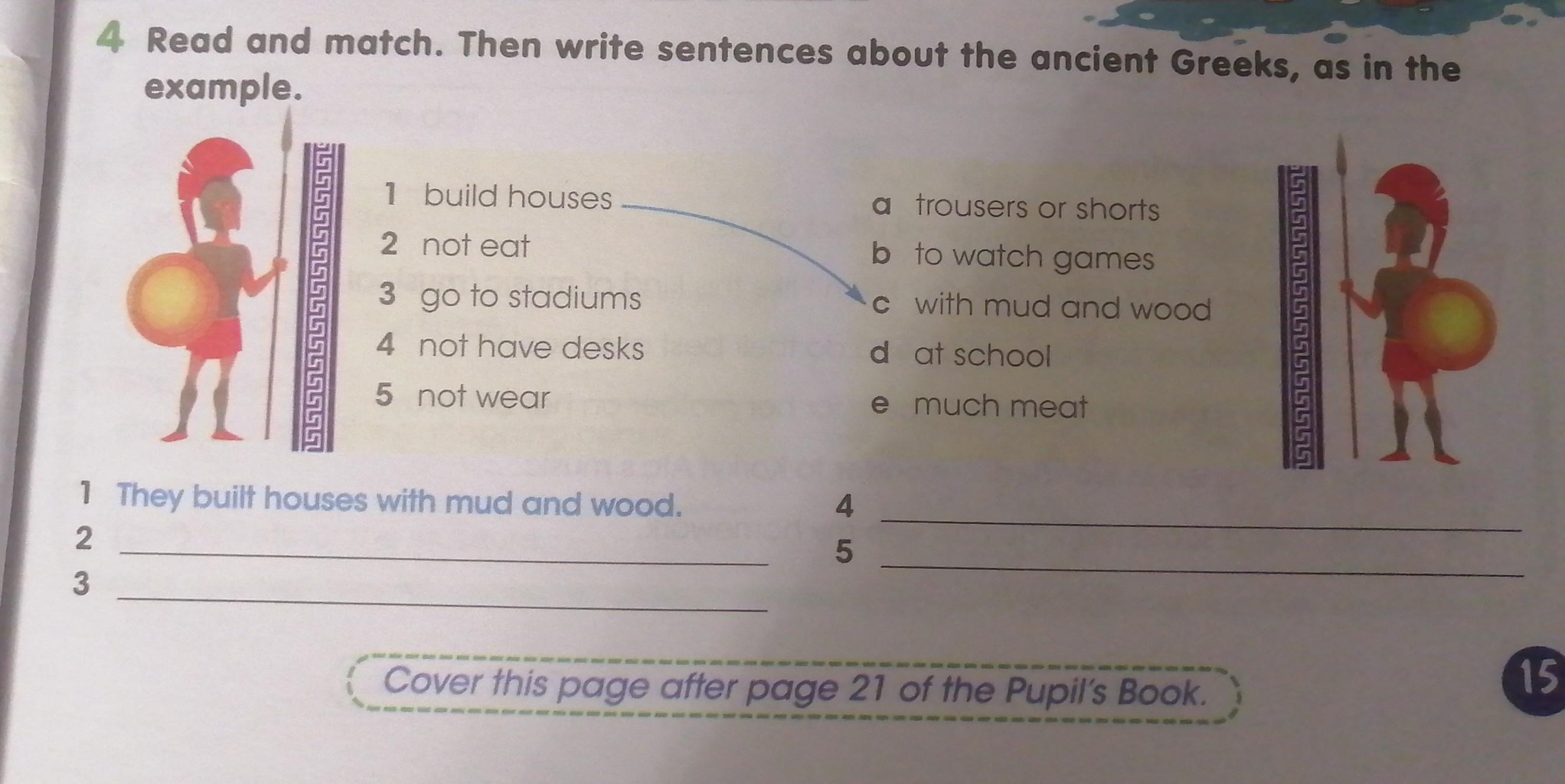 4 Read and match. Then write sentences about the ancient Greeks, as in the example. SUT ច 1 build houses a trousers or shorts 2 not eat b to watch games C with mud and wood 3 go to stadiums 4 not have desks d at school e much meat 5 not wear 155 1511