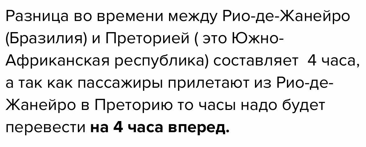 Помогите решить задачу. На сколько часов и в каком направлении следует перевести стрелки часов пассажирам, если они прилетели из Рио-де-Жанейро в Преторию. Пожалуйста с подробным обьяснением