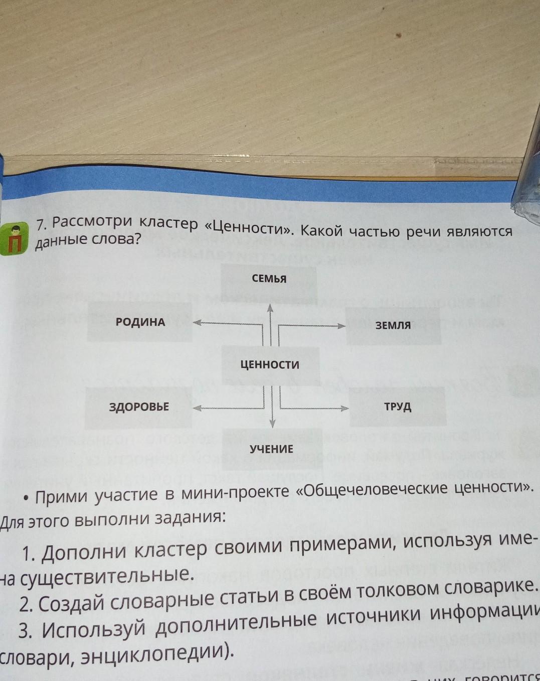 1. Рассмотри кластер «Ценности». Какой частью речи являются данные слова? СЕМЬЯ РОДИНА ЗЕМЛЯ ЦЕННОСТИ ЗДОРОВЬЕ ТРУД УЧЕНИЕ Прими участие в мини-проекте «Общечеловеческие ценности». ля этого выполни задания: 1. Дополни кластер своими примерами, используя име- о существительные. 2. Создай словарные статьи в своём толковом словарике. 3. Используй дополнительные источники информации товари, энциклопедии). их говорится?