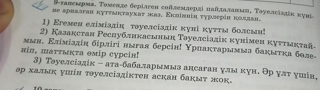 9-тапсырма. Төменде берілген сөйлемдерді пайдаланып, Тәуелсіздік күні- не арналған құттықтаухат жаз. Екпіннің түрлерін қолдан. 1) Егемен еліміздің тәуелсіздік күні құтты болсын! 2) Қазақстан Республикасының Тәуелсіздік күнімен құттықтай- мын. Еліміздің бірлігі нығая берсін! Ұрпақтарымыз бақытқа бөле- ніп, шаттықта өмір сүрсін! 3) Тәуелсіздік – ата-бабаларымыз аңсаған ұлы күн. Әр ұлт үшін, әр халық үшін тәуелсіздіктен асқан бақыт жоқ.