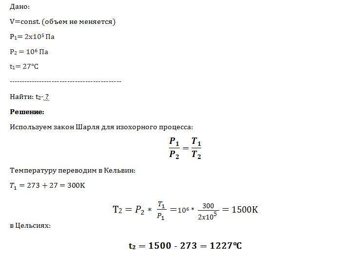 Газ нагревали при постоянном объёме. Его давление при этом увеличилось от 2*10^5 до 10^6 Па. Какой стала температура газа, если в начале процесса она была равна 27 градусов Цельсия?