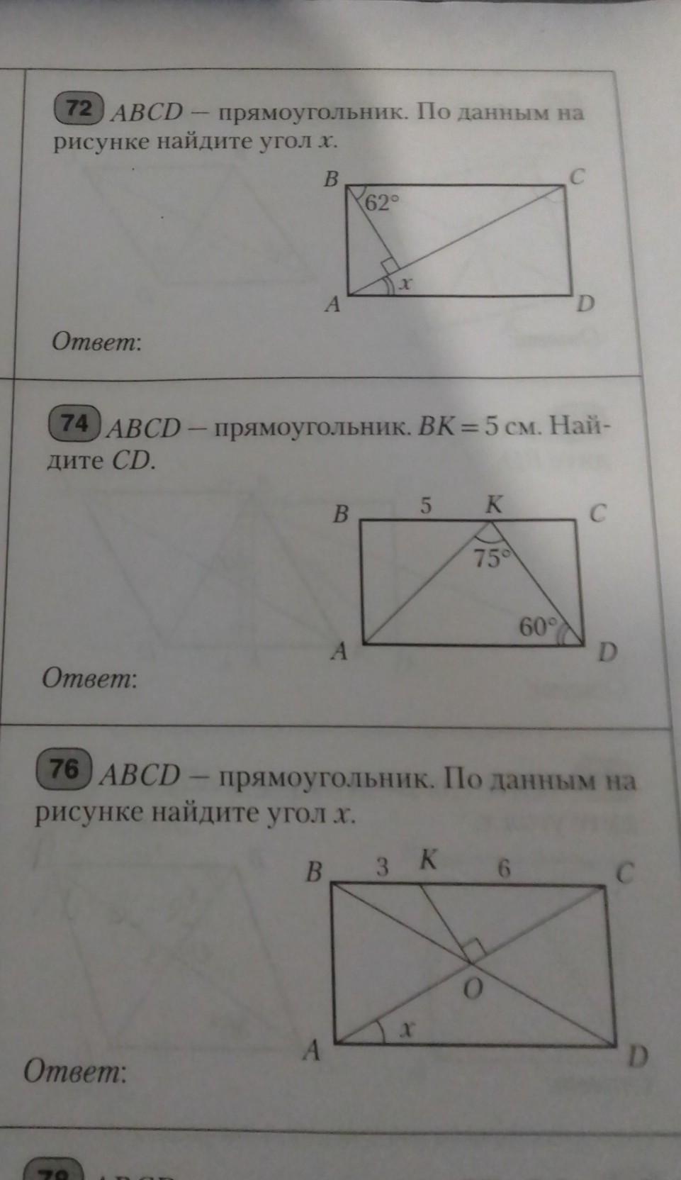 72 Треугольник АВХ прямоугольный. Угол В 90 градусов, вершина треугольника 90-62=28.По теореме Пифагора сумма углов прямоугольного треугольника =180,следовательно 28+90=118,180-118=62градуса равен угол А, угол А прямоугольный, следовательно 90-62=28 градусов =угол х
