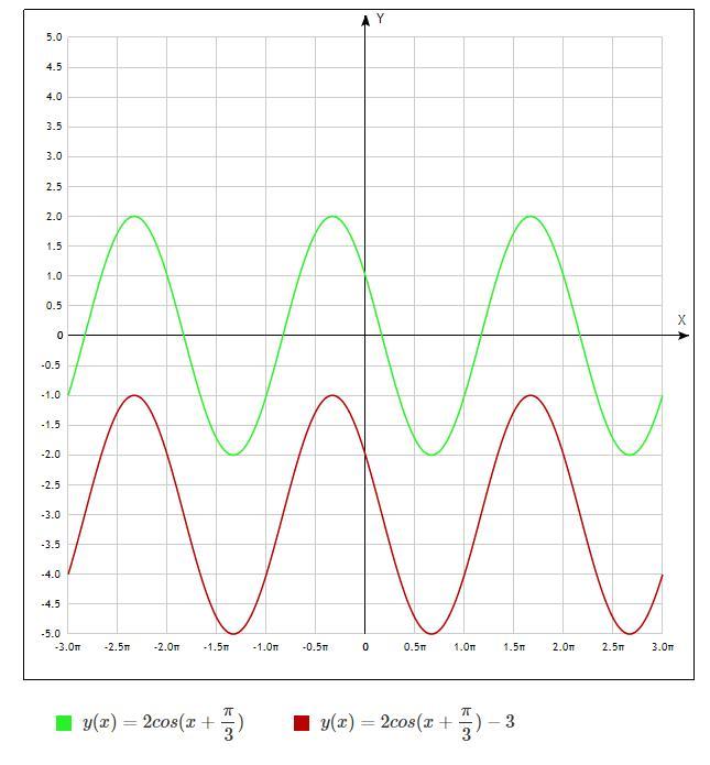 б)коэффициент 2 перед косинусом растягивает розовый график вдоль оси у в 2 раза-зеленый