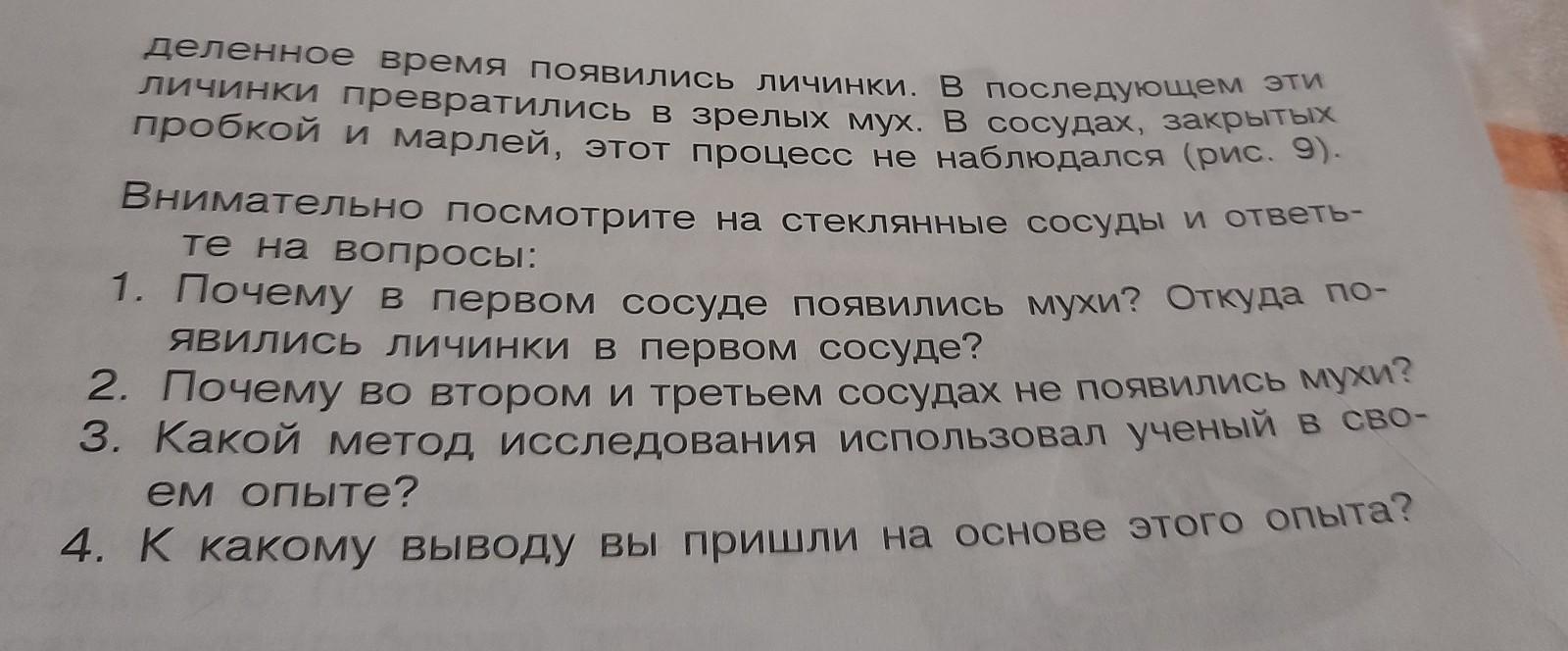 4. В первом сосуде появились мухи так как в нём находилось мясо следовательно и появились личинки.