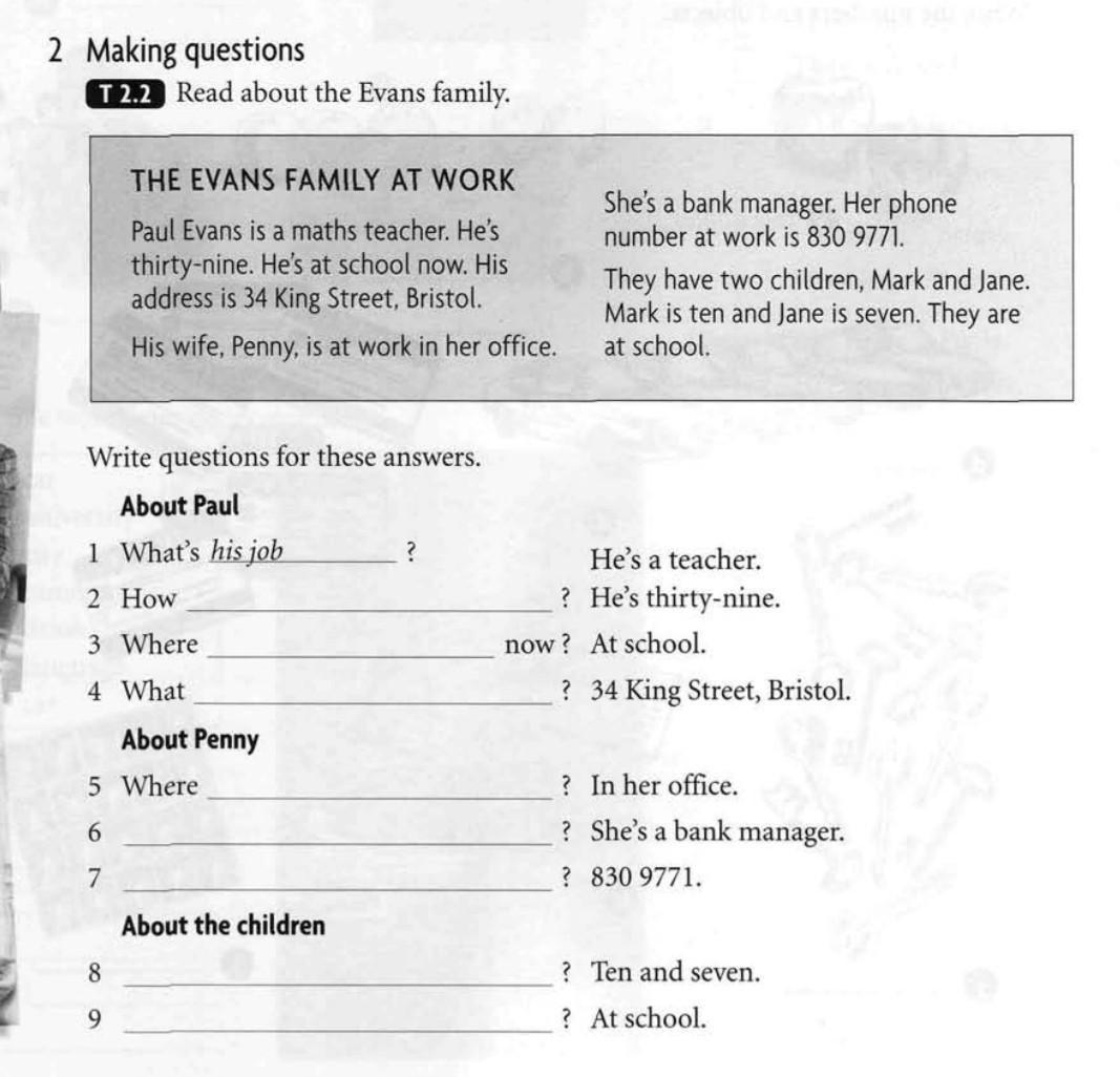 2)How old is he? He's thirty-nine. 3) Where is he now? - At School. 4)What is his adress? - 34 King Street, Bristol
