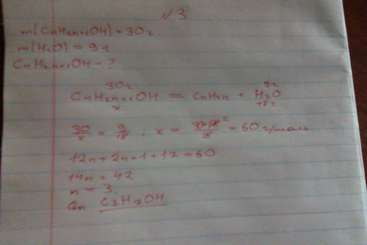 3. При внутримолекулярной дегидратации 30 г предельного одноатомного спирта получили 9 г воды. Вычисл формулу спирта.