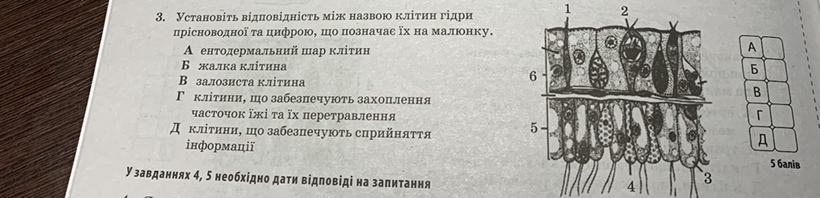 Установіть відповідність між назвою клітин гідри прісноводної та цифрою що позначає їх на малюнку.