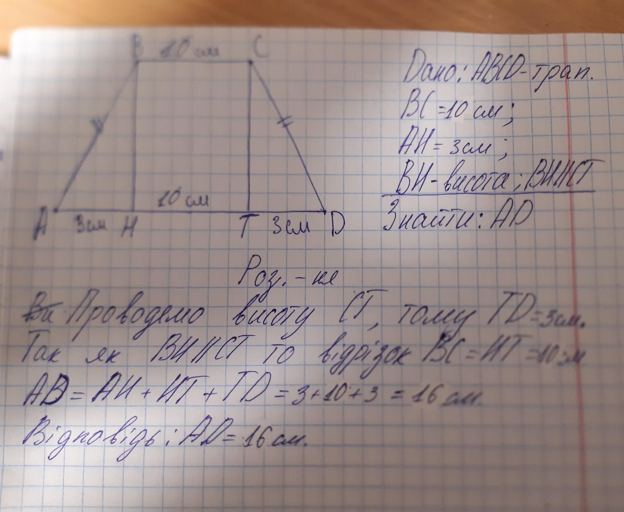 Менша основа рівнобедреної трапеції дорівнює 10 см. Знайдіть більшу основу трапеції, якщо висота, проведена з вершини тупого кута, ділить її на відрізки, один із яких дорівнює 3 см.
