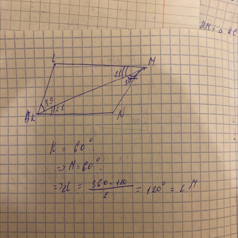 Ну смотри, там накрест лежащие углы просто по свойства параллелограмма, их сумма 60° ну и просто по сумме остальные два по 120