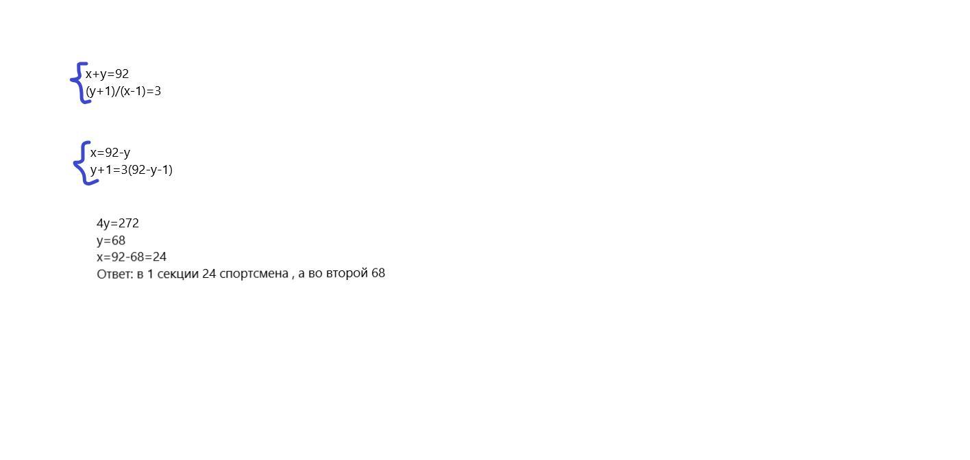 Объяснение: Тут просто нужно составить простенькую систему . Примем количество спортсменов в 1 секции за х , а во второй за у , следовательно (1)х+у=92 , а второе уравнение будет выглядеть так (2)(у+1)/(Х-1)=3 и решаем систему из 2 уравнений .