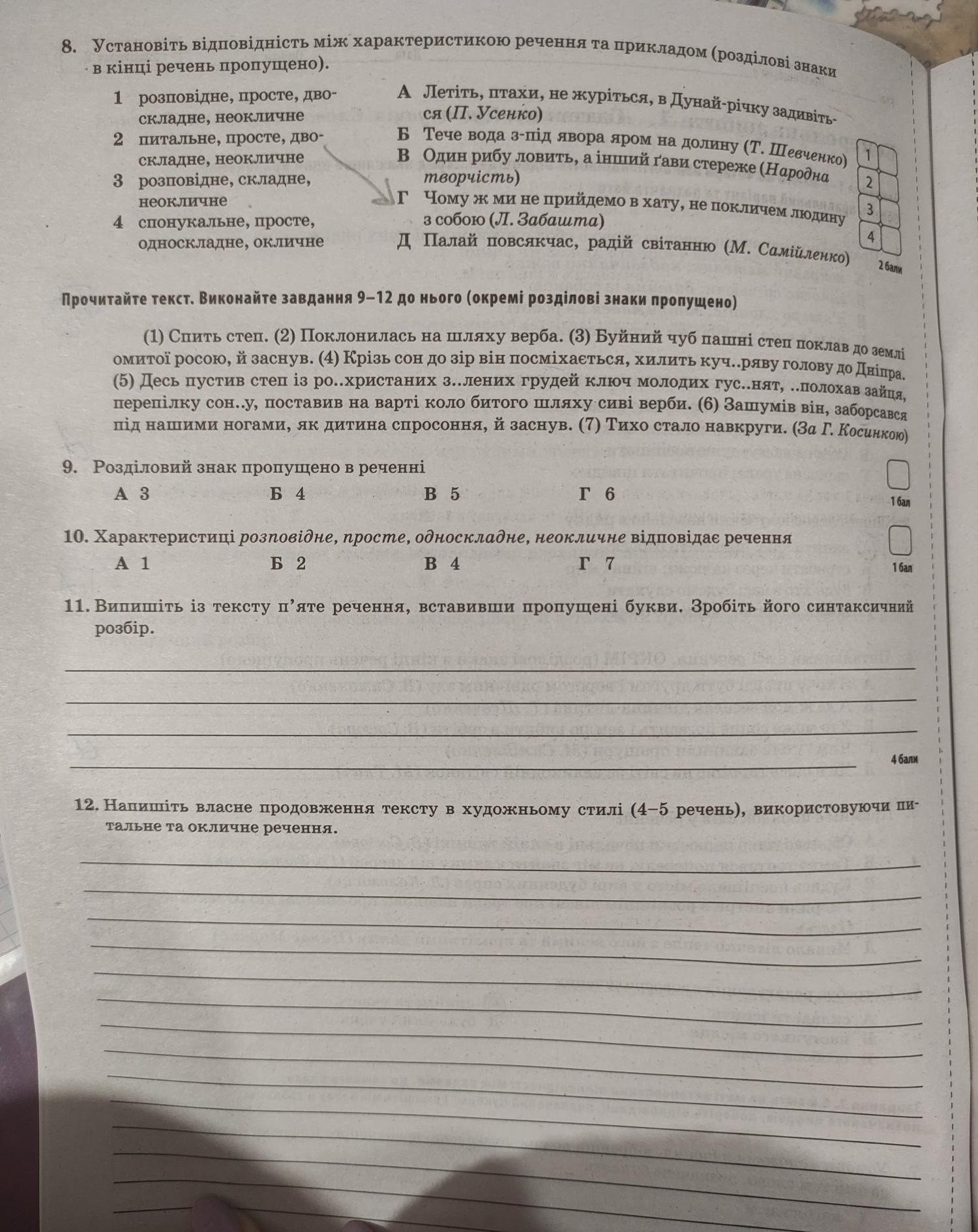 11 Десь пустив степ із розхристаних зелених грудей ключ молодих гусенят,.... полохав (не знаю что ставить) зайця, перепілку сонну, поставив на варті коло битого шляху сиві верби. (розповідне, неокличне, поширене, складне)