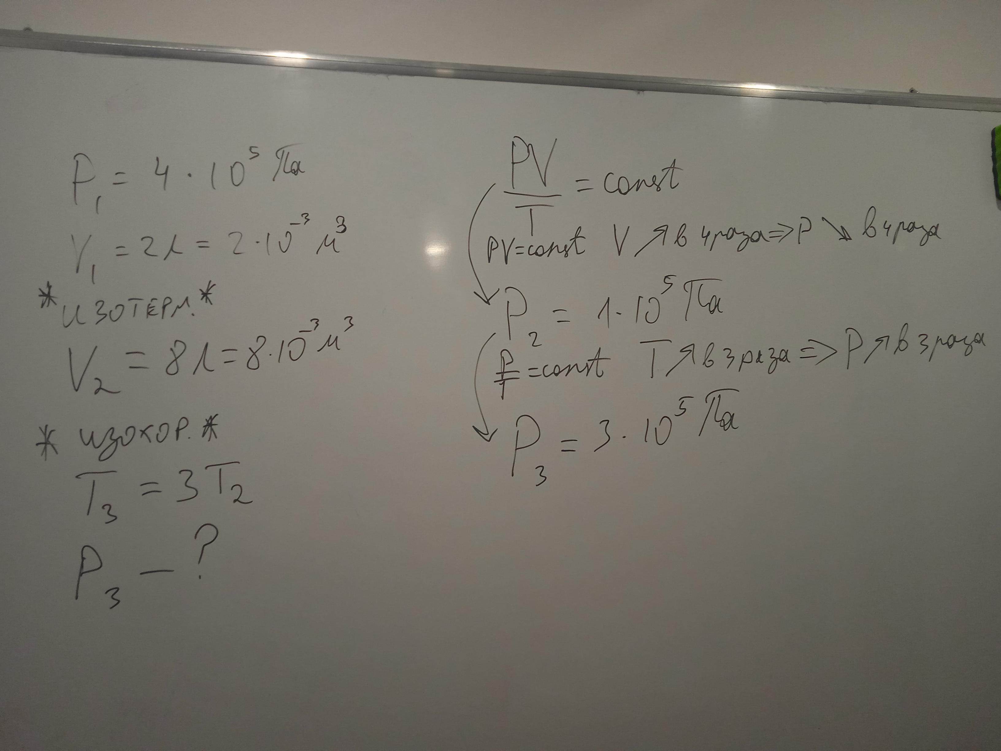 7. Идеальный газ, давление которого p1 = 4 · 10^5 Па, занимал объём V1 = 2 л. Сначала газ изотермически расширили до объёма V2 = 8 л, а затем изохорно нагрели, в результате чего его абсолютная температура увеличилась в α = 3 раза. Определите давление р3 газа в конце процесса, если при переходе из начального состояния в конечное масса газа оставалась неизменной.