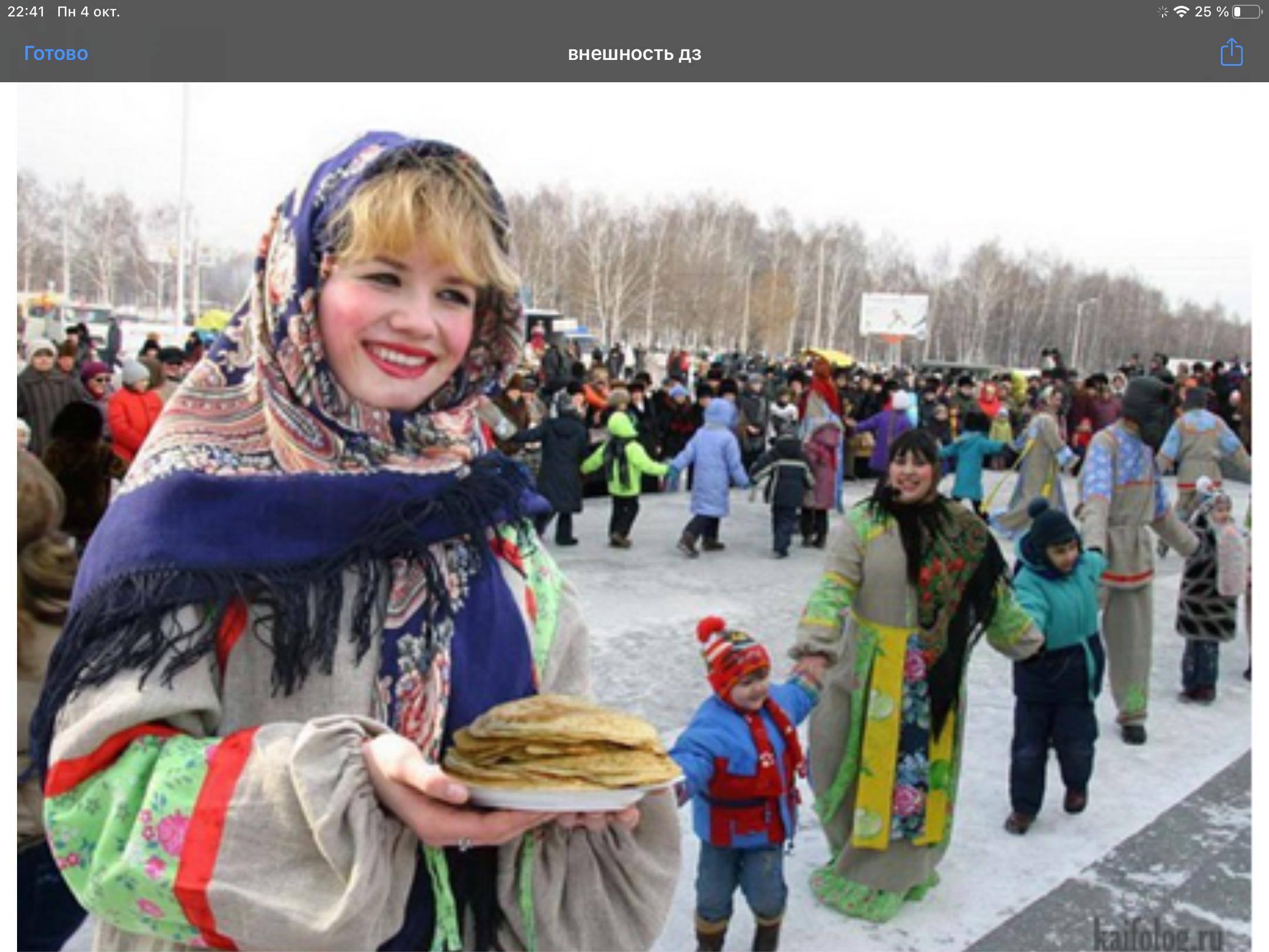 У девушки очень красивое, улыбающиеся лицо. Потому, что на картине можно понять что наступила масленица. На голове у девушки повязан платок, одета она в нарядное русско- народное платье, в руках у девушки тарелка с блинами. На Руси есть традиция: Русские девушки должны испечь блины. И угостить всех тех кто пришёл на праздник.