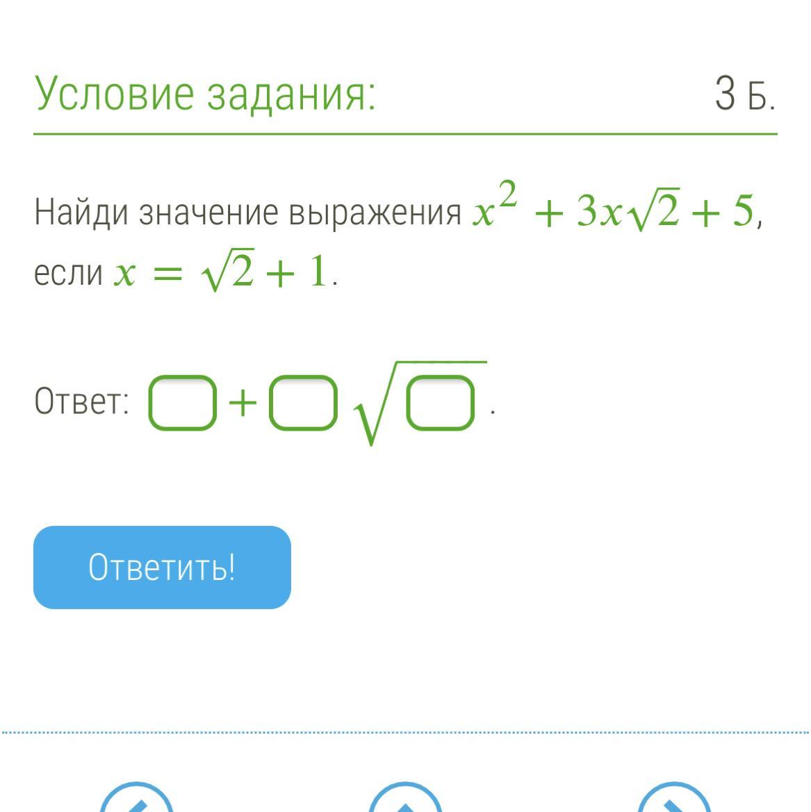 x=\sqrt{2} +1\\\\x^{2}+3x\sqrt{2} +5=(\sqrt{2}+1)^{2}+3\sqrt{2}\cdot(\sqrt{2} +1)+5=2+2\sqrt{2}+1+6+3\sqrt{2} +5=\\\\=\boxed{14+5\sqrt{2} }