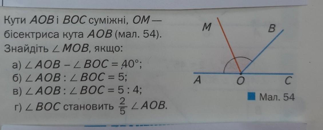 в) нехай ВОС - 4х, тоді АОВ - 5х, тому 5х+4х=180, 9х=180, х=20, ВОС=80°, АОВ=100°, МОВ=половина кута АОВ=50°