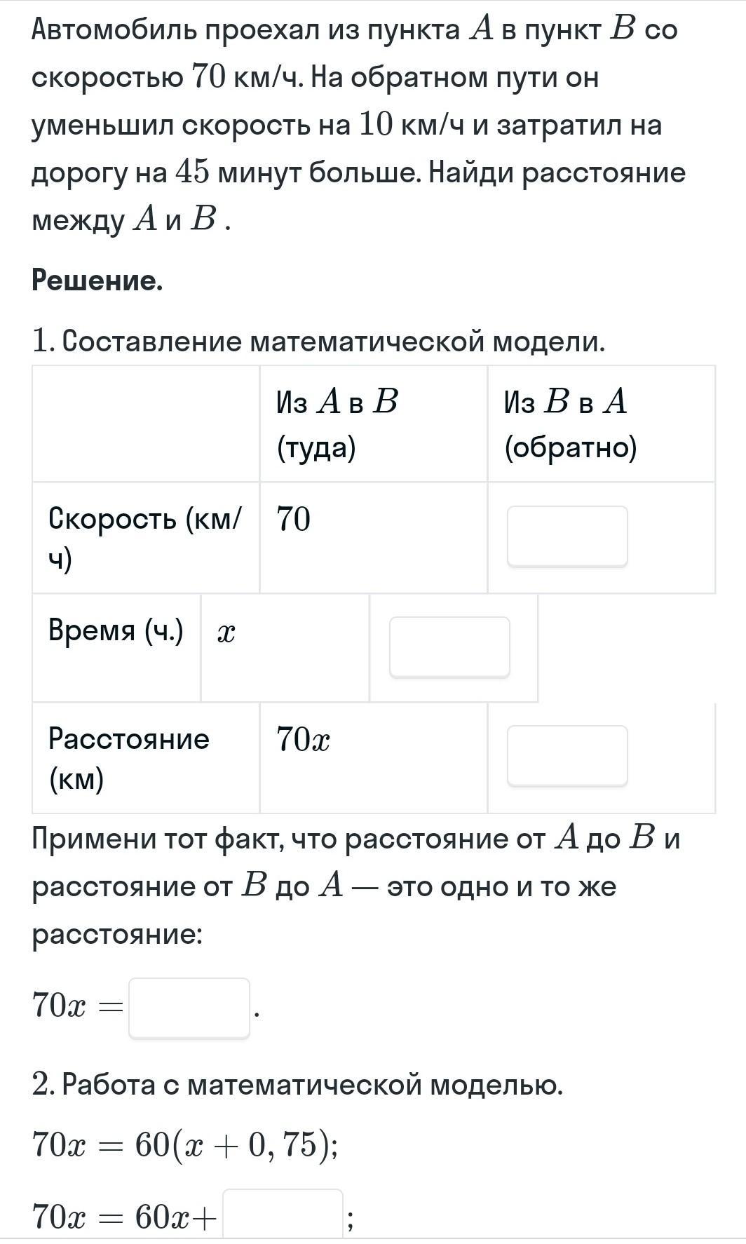 туда: 70x // обратно: 60(x+0.75) (расстояние = скорость × время)