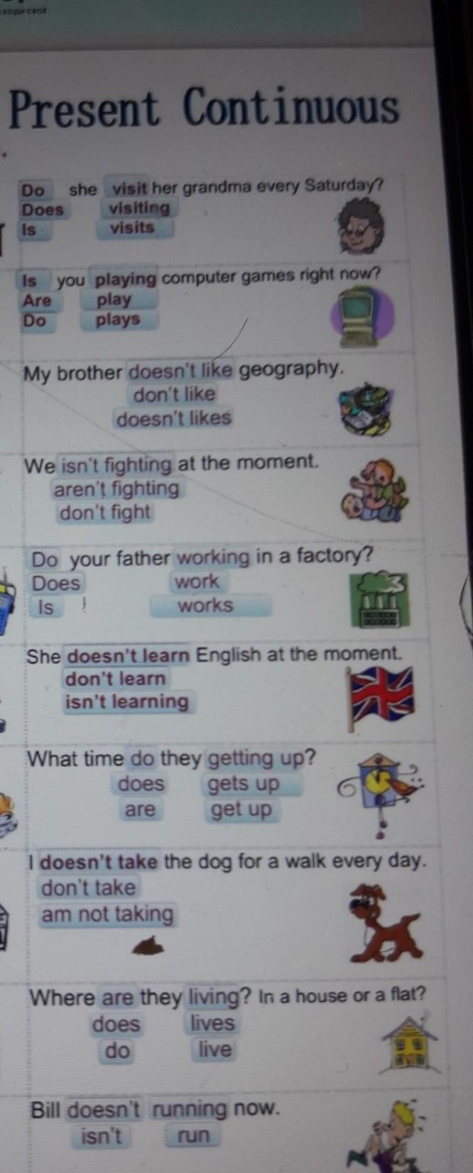 Present Continuous m. Do she visit her grandma every Saturday? Does visiting is visits Is you playing computer games right now? Are play Do plays My brother doesn't like geography, don't like doesn't likes t. We isn't fighting at the moment. aren't fighting don't fight Do your father working in a factory? Does work Is works SOS She doesn't learn English at the moment. don't learn isn't learning What time do they getting up? does gets up are get up I doesn't take the dog for a walk every day. don't take am not taking Where are they living? In a house or a flat? does lives do live Bill doesn't running now. isn't run a :)