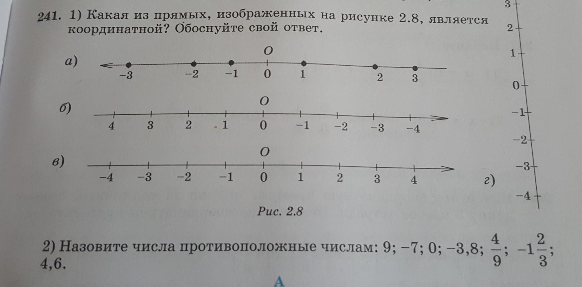241. 1) Какая из прямых изображенных на рисунке 2.8 является координатной обоснуйте свой ответ -3 -2 -1 0 1 2 3 4 3 2 1 0 -1 -2 -3 -4 -4 -3 -2 -1 0 1 2 3 4 2) Назовите числа противоположные числам: 9; -7; 0; -3,8; 4целых9; -1 2целых3; 4,6;