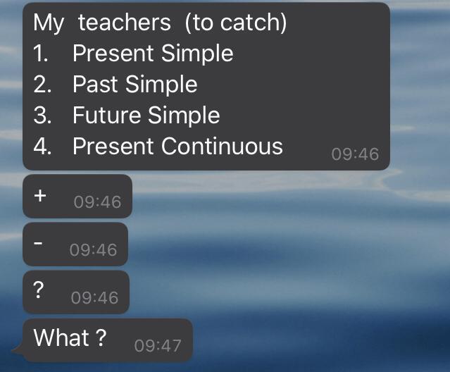 Нужно сделать “My teacher ( to catch )” в Present Simple, Past Simple, Future Simple, present continues в утвердительной, отрицательной и вопросительной форме