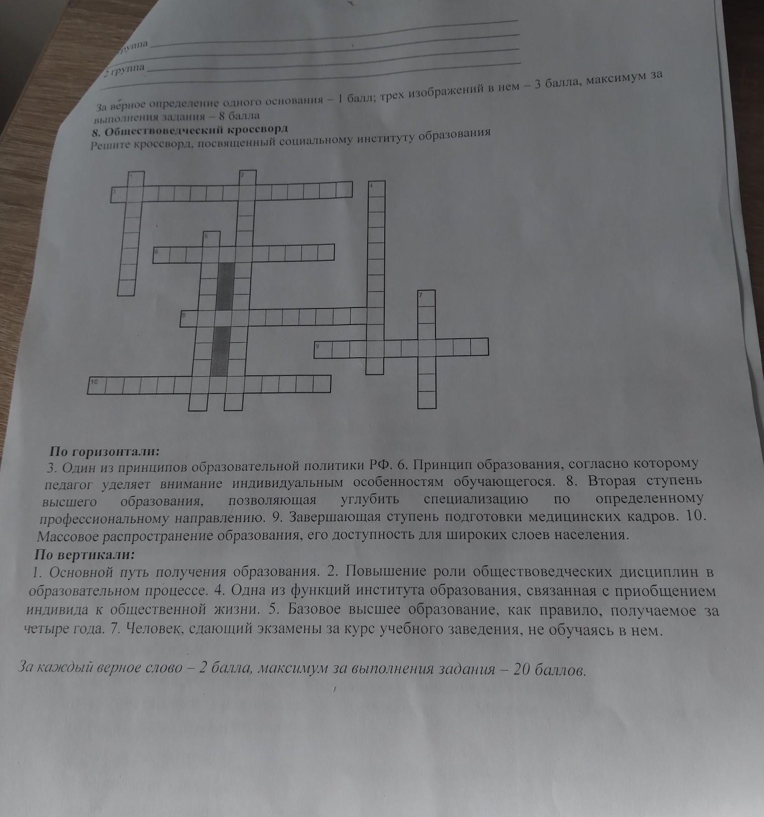 Обществоведческий кроссворд Решите кроссворд, посвященный социальному институту образования то По По горизонтали: 3. Один из принципов образовательной политики РФ. 6. Принцип образования, согласно которому педагог уделяет внимание индивидуальным особенностям обучающегося. 8. Вторая ступень Высшего образования, позволяющая углубить специализацию определенному профессиональному направлению. 9. Завершающая ступень подготовки медицинских кадров. 10. Массовое распространение образования, его доступность для широких слоев населения. По вертикали: 1. Основной путь получения образования. 2. Повышение роли обществоведческих дисциплин в образовательном процессе. 4. Одна из функций института образования, связанная с приобщением индивида к общественной жизни. 5. Базовое высшее образование, как правило, получаемое за четыре года. 7. Человек, сдающий экзамены за курс учебного заведения, не обучаясь в нем.