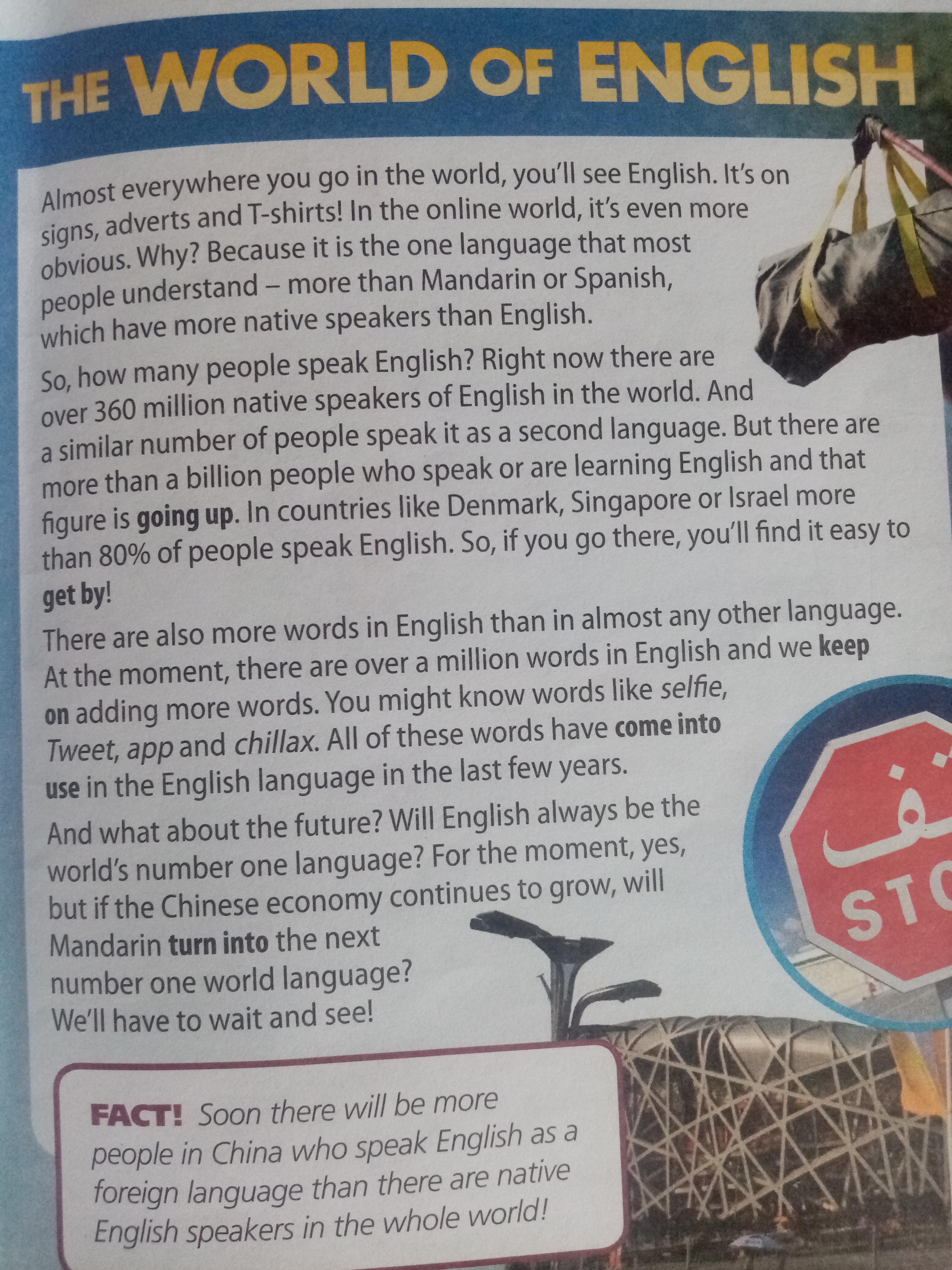 3 Read the article again. Mark the sentences true (T) or false (F). Correct the false ones. 1 English is everywhere because a lot of people understand it. 2 There are fewer second language speakers of English than native speakers. 3 In Denmark, people speak English as a second language. 4 The English language has the most words. 5 Selfie and app are old words. 6 The author is sure that Mandarin will be the world's next number one language.