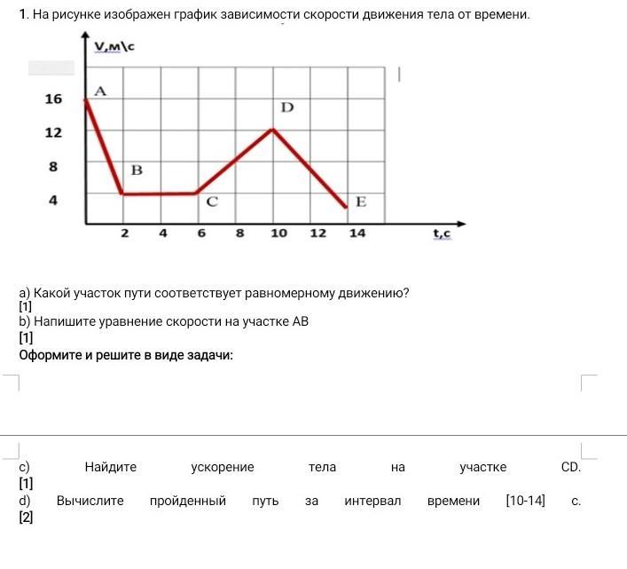 На рисунке изображен график зависимости скорости движения тела от времени. a) Какой участок пути соответствует равномерному движению? b) Напишите уравнение скорости на участке АВ c) Найдите ускорение тела на участке СD. d) Вычислите пройденный путь за интервал времени [10-14] c.