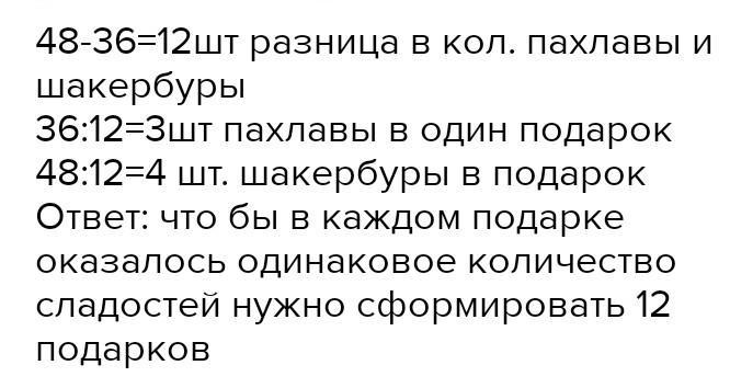 Помогите пж!! 48 штук пахлавы и 36 штук шекербуры необходимо упаковать в одинаковые подарочные коробки. Какое наибольшее число коробок можно приготовить?