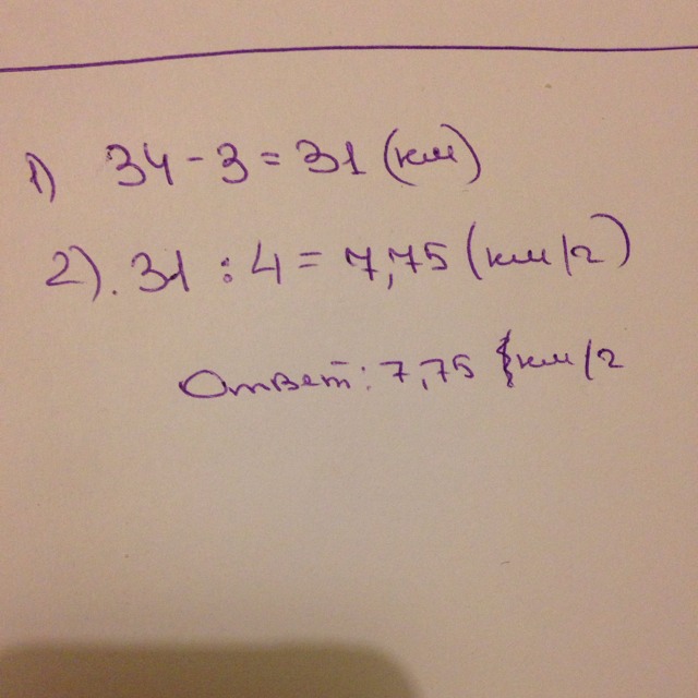 Лесник прошёл 3 км и 4ч ехал на лошади . С какой скоростью он ехал на лошади если весь путь равен 34 км?