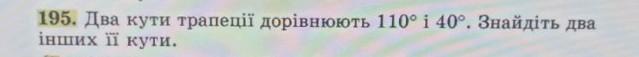Так как 110°+40°=150°, 150°≠180°, то углы 110° и 40° – противоположные углы трапеции. Тогда, пусть в трапеции АВСD <А=40°, <С=110°, тогда, <В=180°-<А=180°-40°=140°; 140°/2=70°(по свойству углов трапеции). Ответ: два неизвестных угла трапеции равны 140° и 70°.