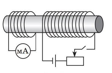 Дві котушки мають спільне осердя (див. рис.). В першому досліді стрілка міліамперметра при замиканні ключа відхилилася на 4 поділки. На скільки поділок відхилиться стрілка, якщо повзунок реостата посунути праворуч збільшивши опір вдвічі та знову замкнути ключ? Відповідь подайте у вигляді цілого числа.